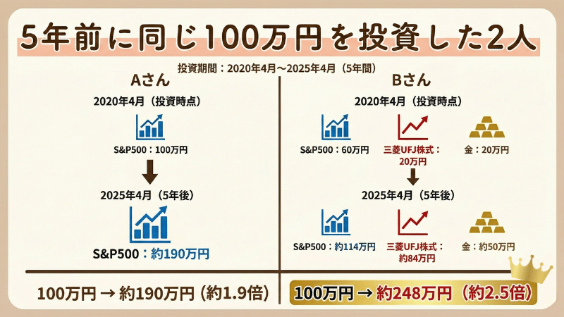 実際にS&P500だけに投資した人と、プラスで個別株と金にも投資した人では、同じ投資額でも5年で利益に50万円以上の差が生じたケースも✨