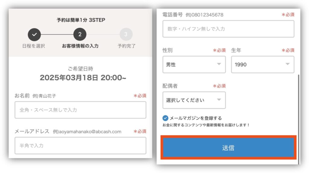 氏名やメールアドレス、電話番号などを入力して「送信」をタップ。